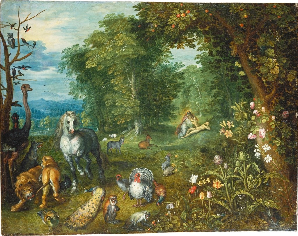 "Paraíso con la Creación de Eva" realizada por Jan Brueghel el Joven en el siglo XVII.